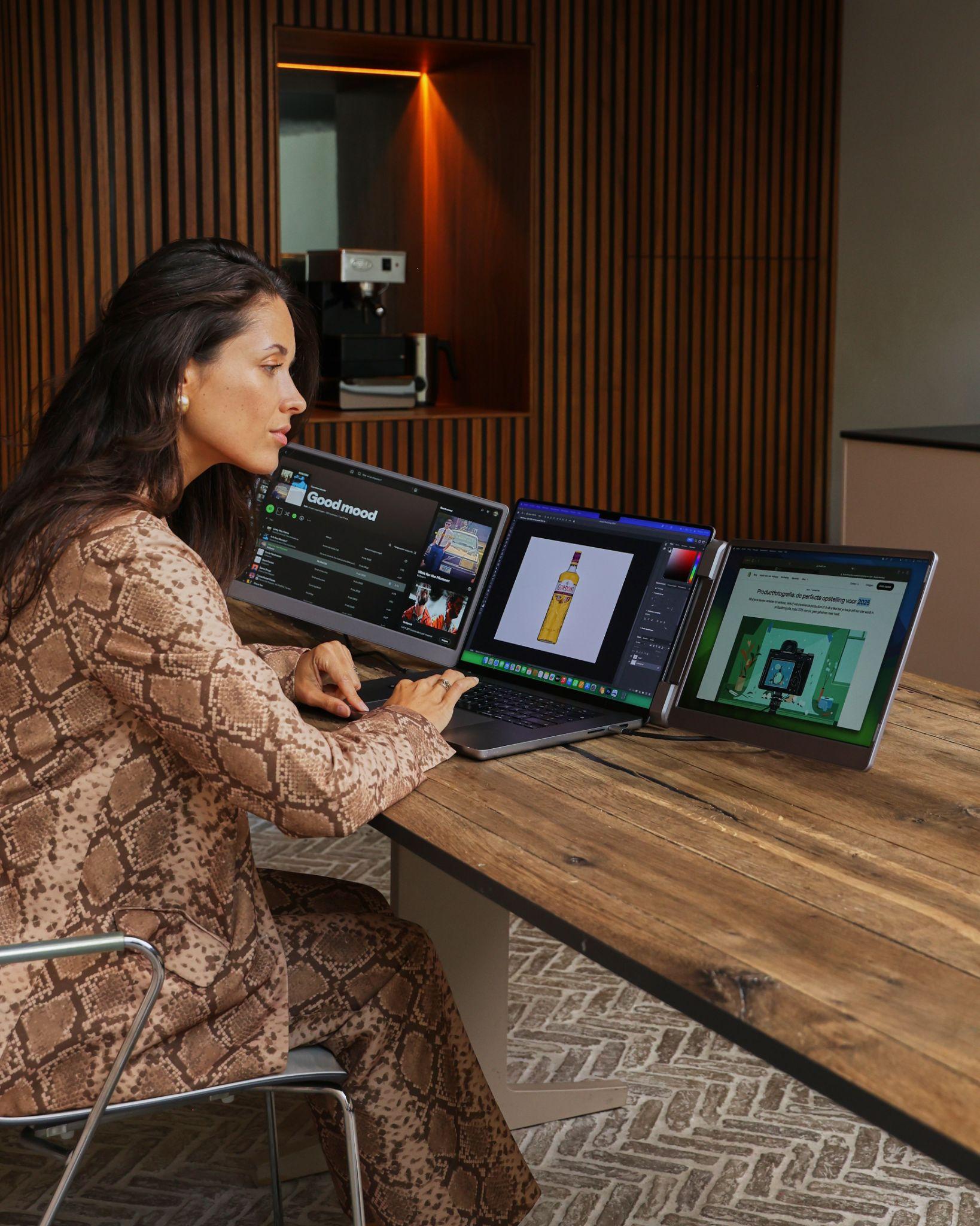 Wil je flexibel kunnen werken én presenteren zonder gedoe? De Screenmate® Flip is een slimme en veelzijdige draagbare monitor die je werkplek in één beweging uitbreidt met twee extra schermen. Dankzij het robuuste ontwerp en het heldere 15,6 inch IPS-display is de Screenmate® Flip perfect voor multitasking, samenwerken en presentaties. Het unieke flip-mechanisme maakt het mogelijk om het linker scherm eenvoudig te kantelen richting de persoon die tegenover je zit. Ideaal voor klantgesprekken, teamoverleg of het delen van visuele content. De Screenmate® Flip combineert flexibiliteit, stevigheid en eenvoud met de kwaliteit die je van Screenmate mag verwachten.